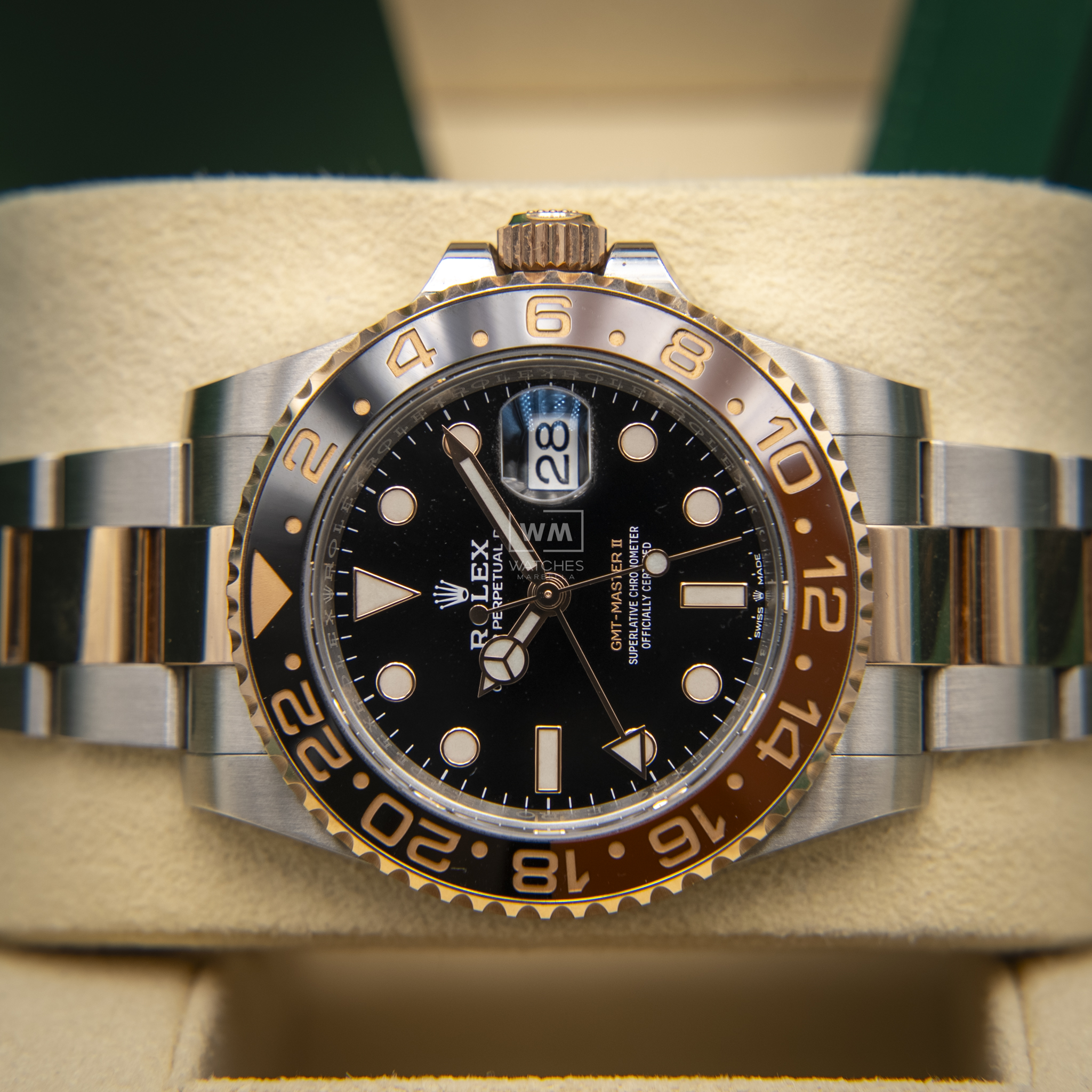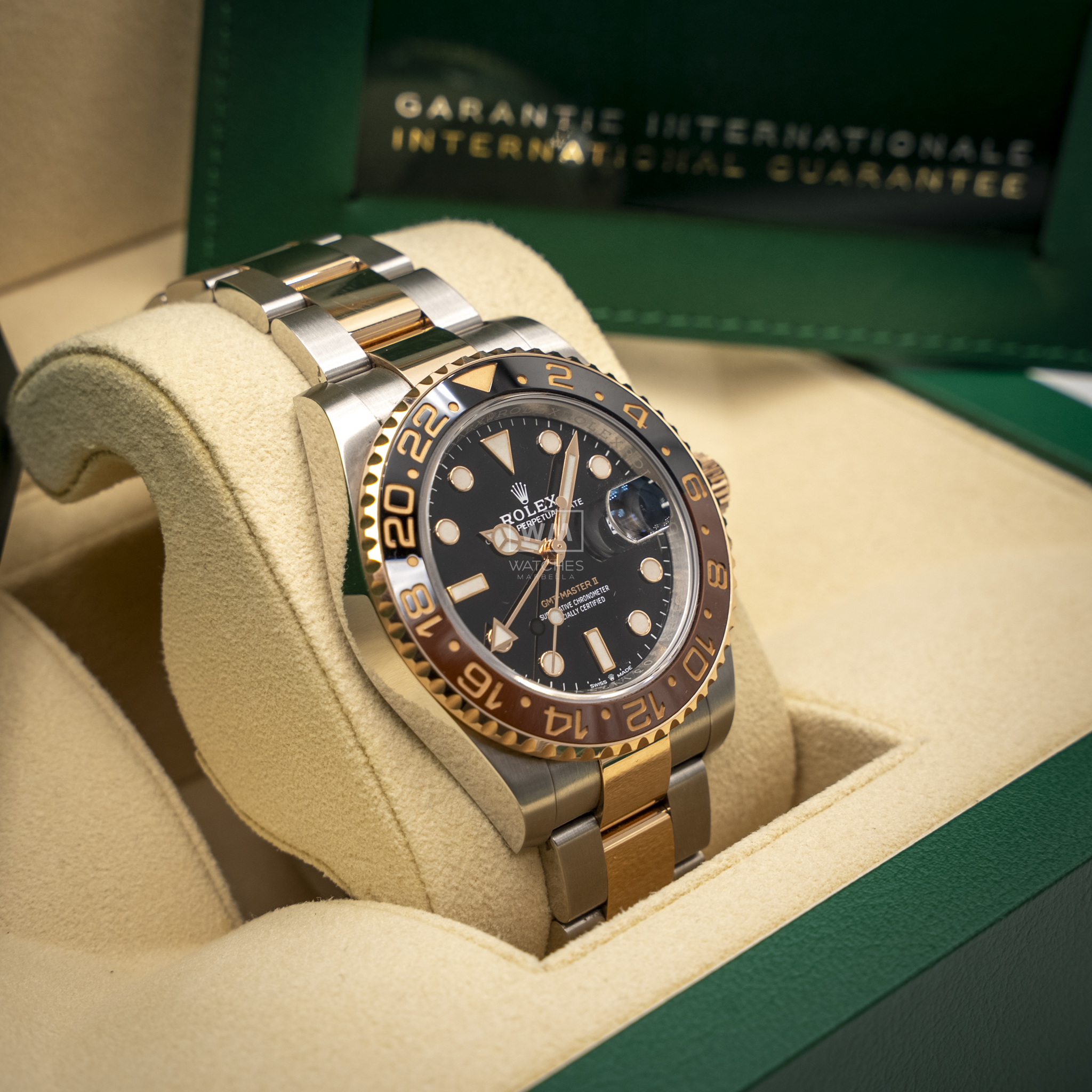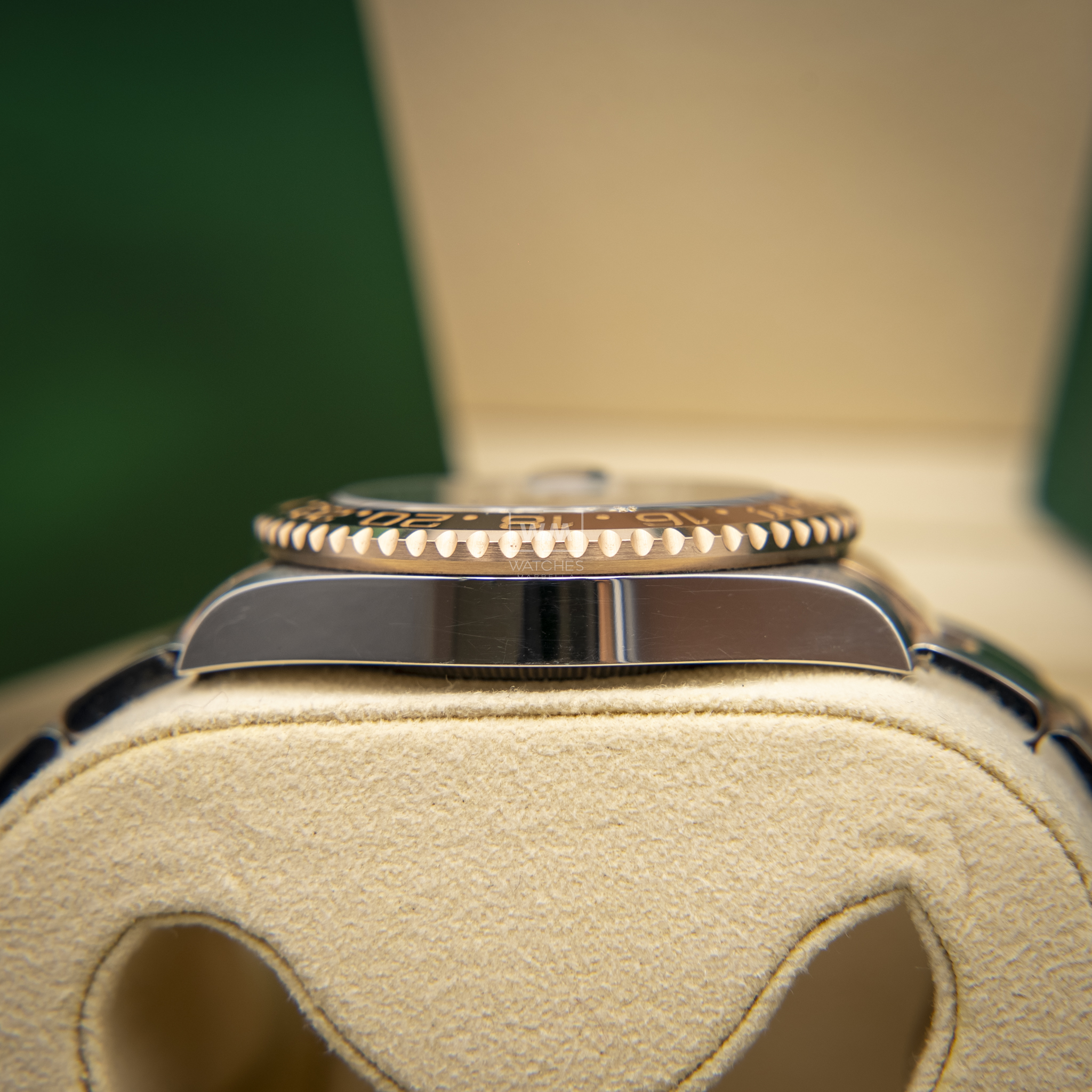 Este modelo presenta una esfera negra y un disco de bisel Cerachrom bicolor en cerámica marrón y negra bicolor. El GMT‑Master II dispone de una aguja adicional que da la vuelta a la esfera en 24 horas y complementa a las tradicionales agujas de las horas, minutos y segundos, así como de un bisel giratorio bidireccional graduado 24 horas.
