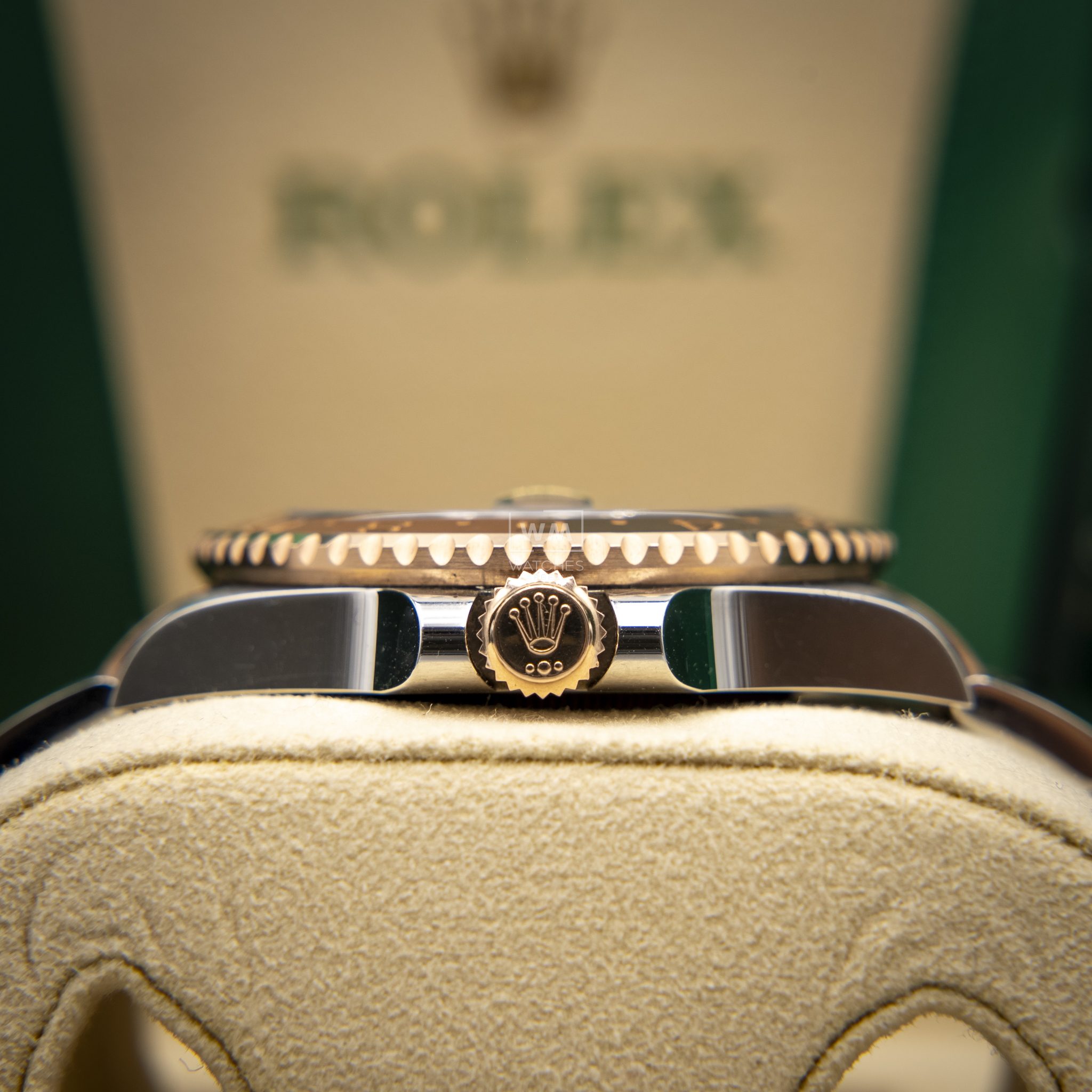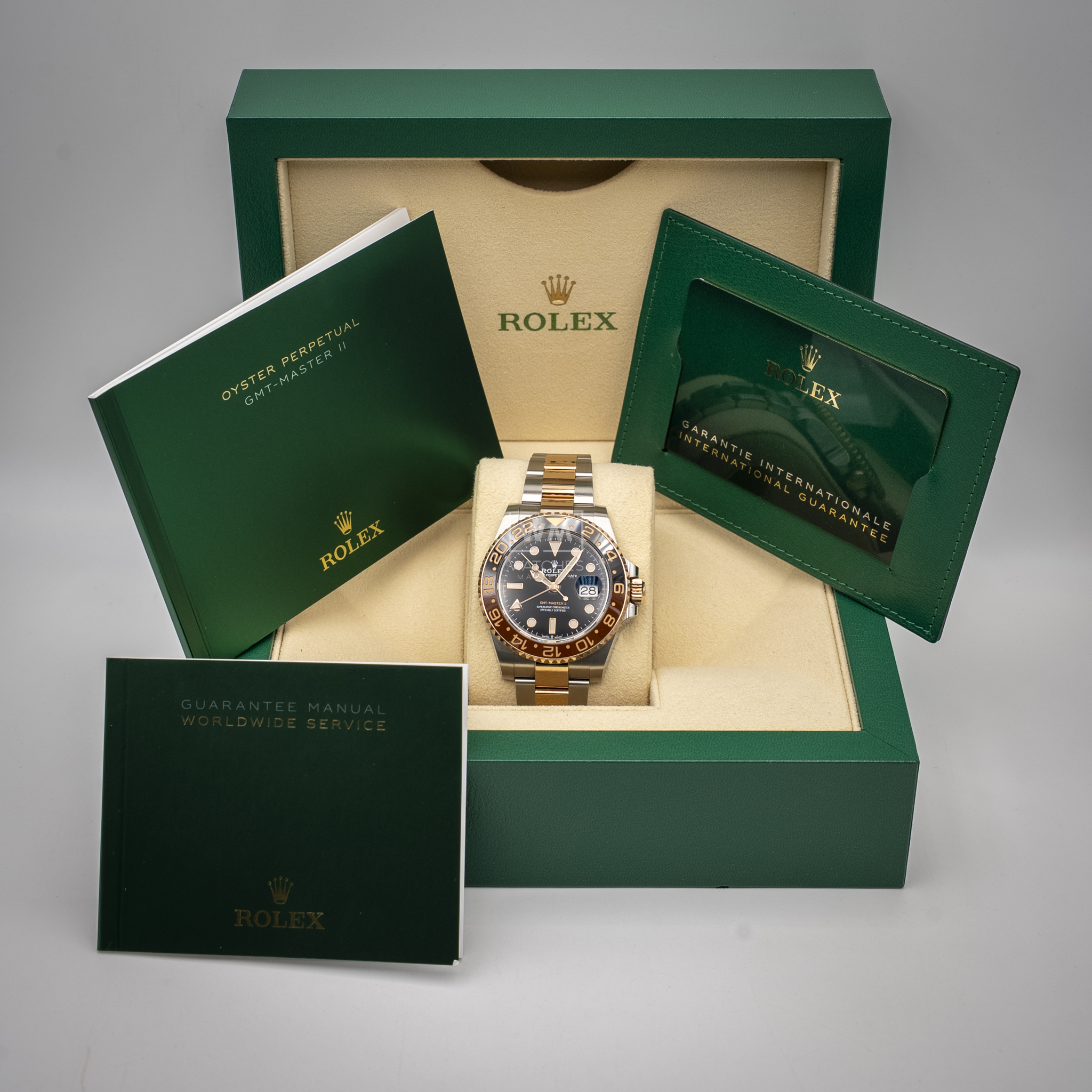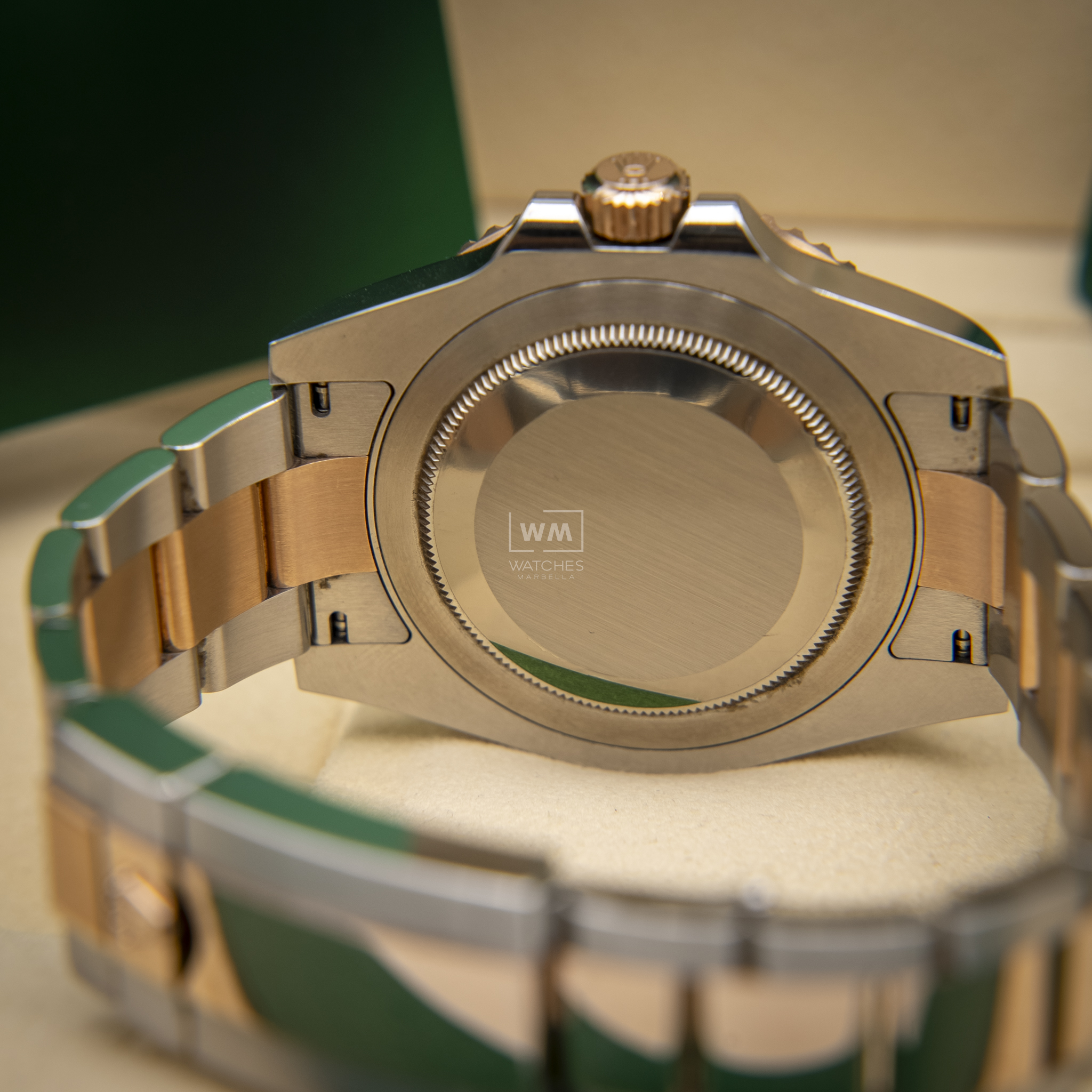 Este modelo presenta una esfera negra y un disco de bisel Cerachrom bicolor en cerámica marrón y negra bicolor. El GMT‑Master II dispone de una aguja adicional que da la vuelta a la esfera en 24 horas y complementa a las tradicionales agujas de las horas, minutos y segundos, así como de un bisel giratorio bidireccional graduado 24 horas.