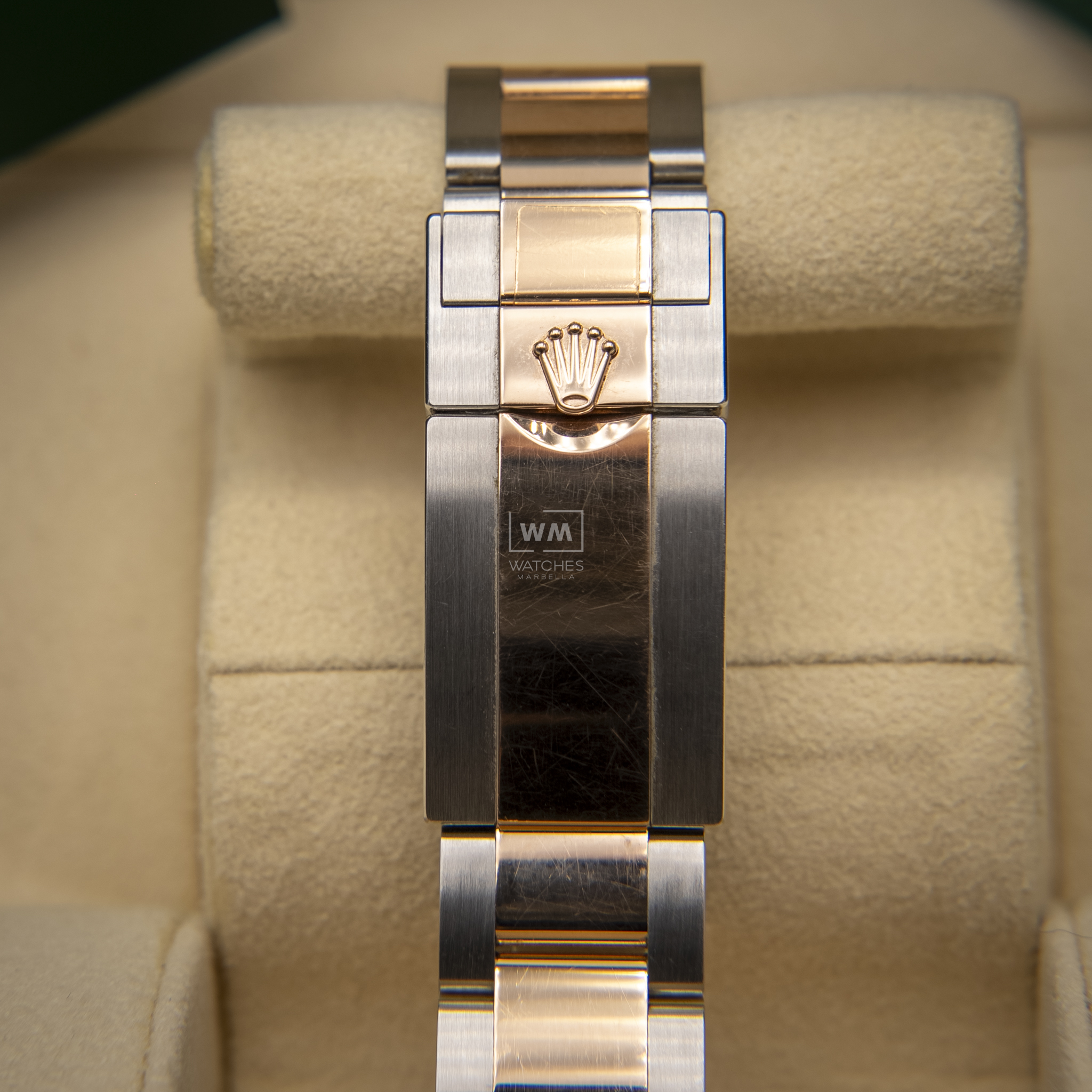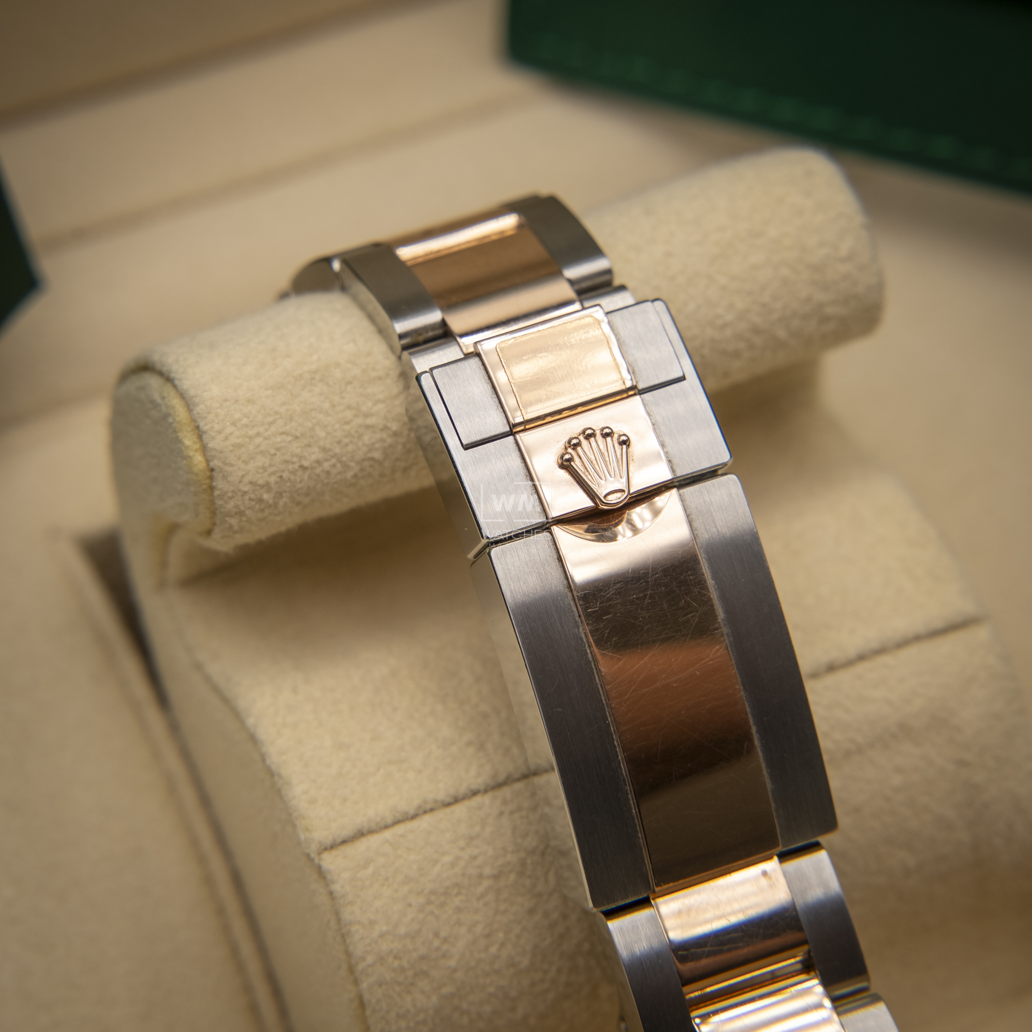 El brazalete Oyster es fruto de una alquimia perfecta entre forma y función, estética y técnica, diseñado para ser a la vez robusto y confortable. Está equipado con un cierre desplegable Oysterlock que evita cualquier apertura accidental, y cuenta con un cómodo sistema de extensión rápida Easylink, otra característica exclusiva de Rolex.