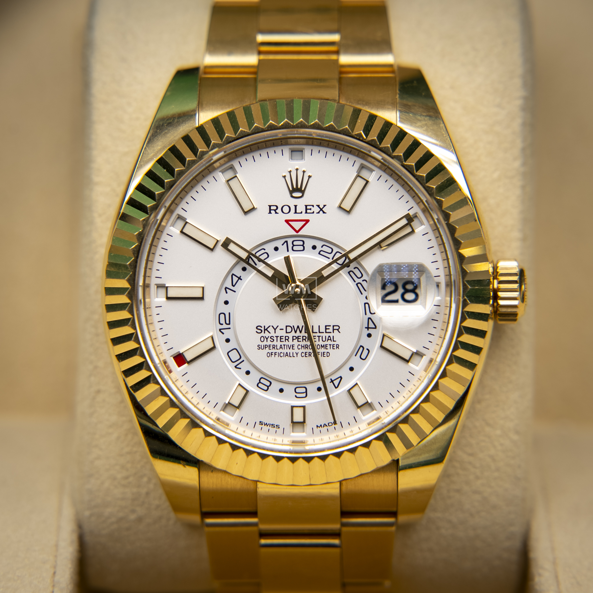 El Sky‑Dweller está dotado de un brazalete Oyster de eslabones macizos de acero Oystersteel en el caso de la versión Rolesor blanco, o de un brazalete Oyster, que combina acero Oystersteel y oro amarillo, en el caso de la versión Rolesor amarillo.